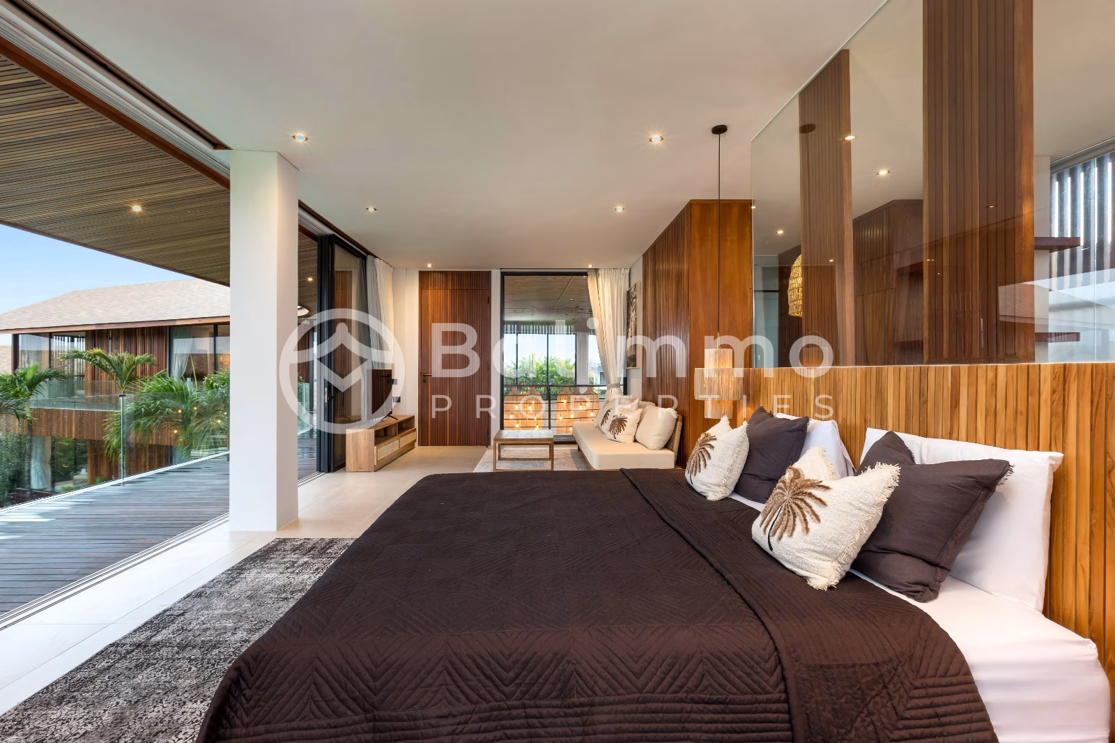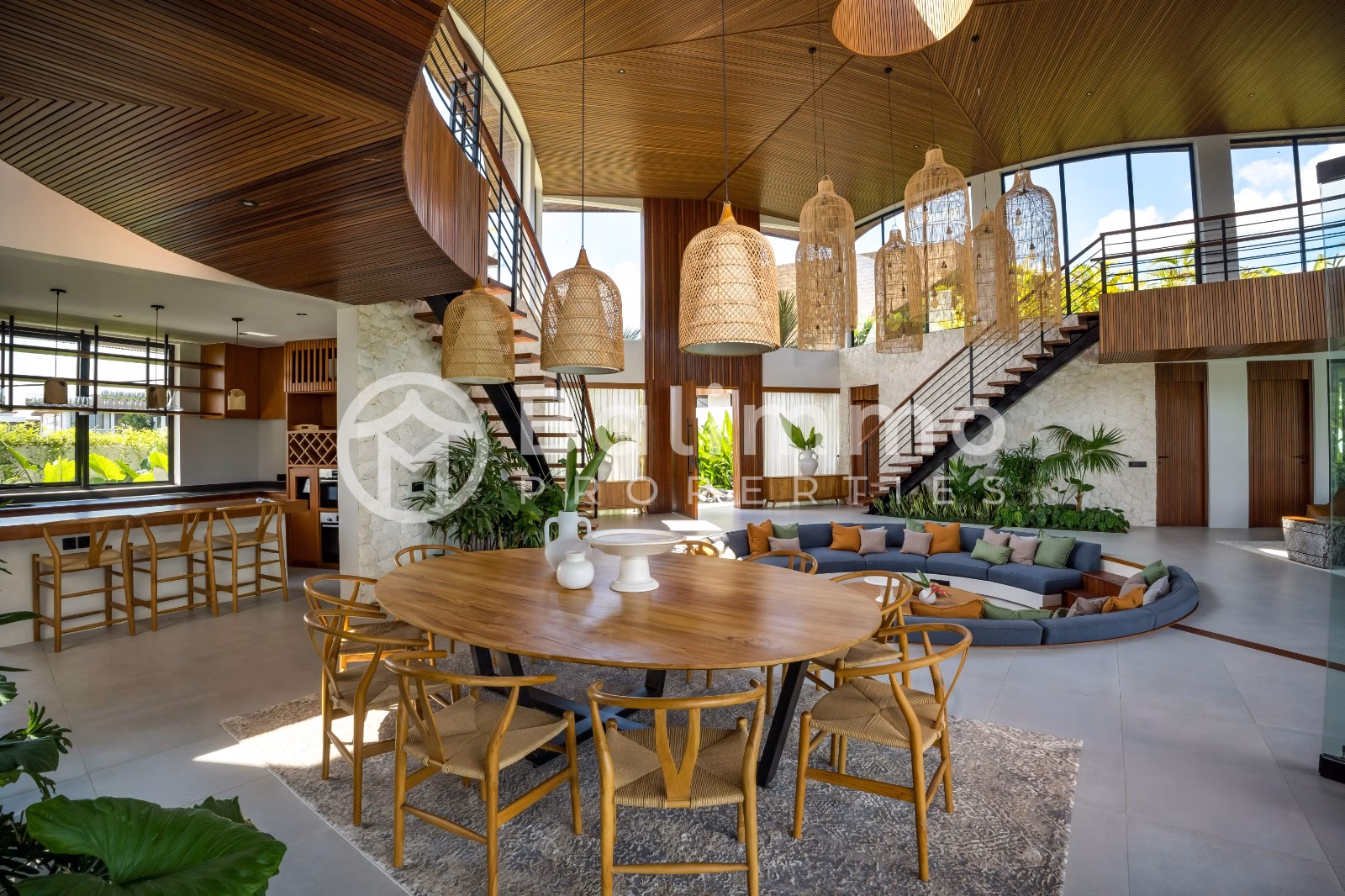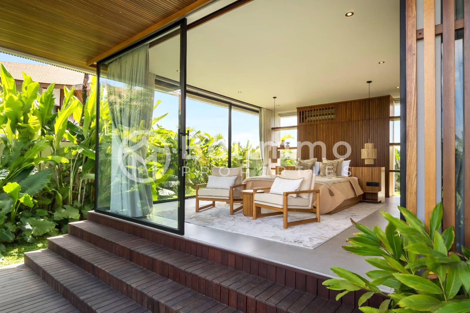 Contemporary Tropical Villa with High-End Design in Tumbak Bayuh Surroundings / Location Situated in the tranquil neighborhood of Tumbak Bayuh, this villa offers a quiet and upscale environment, just minutes from the vibrant hubs of Pererenan and Canggu. The area is known for its peaceful surroundings while remaining close to top cafes, restaurants, and international schools. Built on 1,130 sqm of land, the villa features exceptional build quality and was designed by Spanish architect Nacho of Biombo Architects. The architecture blends tropical elements with contemporary style. Highlights include a 94 sqm swimming pool, spacious garden, sunken seating area, and large terrace. A garage accommodates up to three vehicles. The 828 sqm building is spread over two floors and includes five bedrooms, plus an office and a cinema room. There are six bathrooms in total. The enclosed living area is equipped with air conditioning and connects to a fully equipped BOSCH kitchen and large dining area. Interior finishes include tropical hardwood ceilings and high-end furnishings throughout. Staff quarters are also included. Additional Information * Leasehold until 2 December 2066 * Land size: 1,130 sqm * Building size: 828 sqm * 5 bedrooms + office + cinema room * 6 bathrooms * Fully furnished * Parking for 3 vehicles * Permit: SHGB * Zoning: yellow (residential) * Selling price: IDR 32 billion (approx. USD 1,900,000) BALIMMO PROPERTIES – Contact us to schedule a visit.