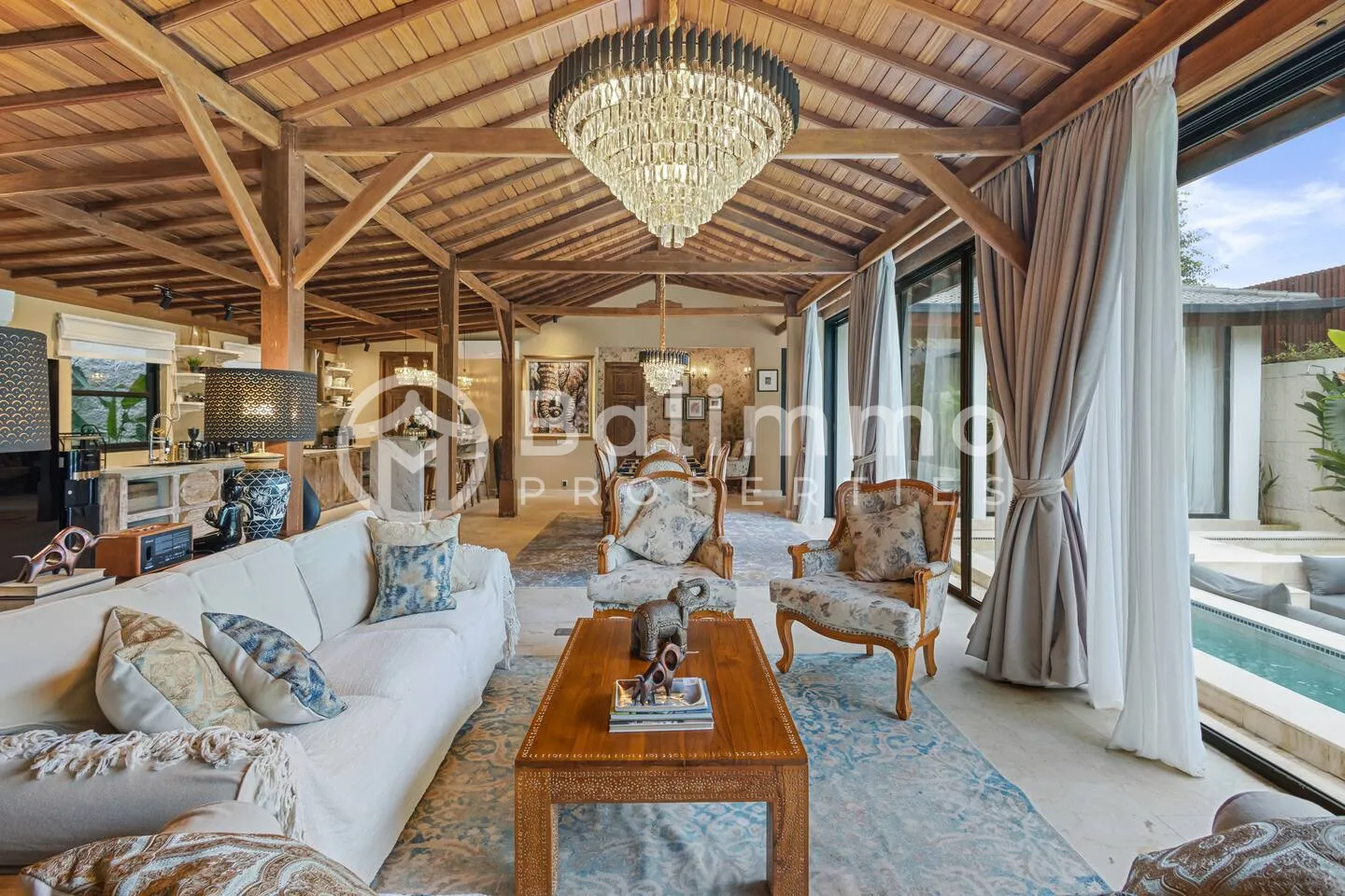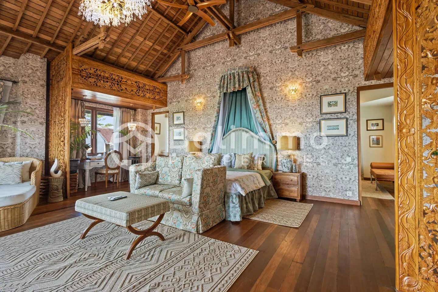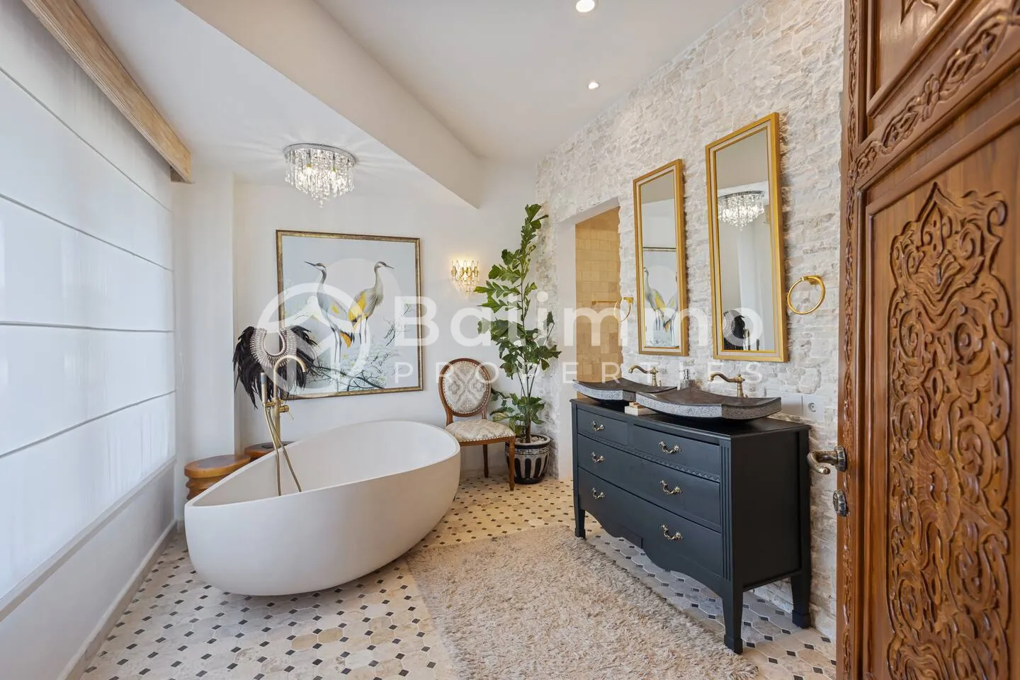 Jimbaran Classic Villa Located in Jimbaran, this villa is 5–10 minutes from Jimbaran Beach and its beachfront seafood restaurants, 15 minutes from Rock Bar at AYANA and GWK Cultural Park, and 20–25 minutes from Balangan, Dreamland, and Uluwatu beaches. Built on 420 m2 of land, the property features a private swimming pool, barbecue area, and private parking. The design combines classic European style with Balinese elements. The 330 m2 interior includes four bedrooms (including a kids’ room), a spacious living room, walk-in wardrobe, home office, and storage. Interiors include hand-carved panels, chandeliers, patterned wallpapers, and custom textiles. Leasehold 25 years + 15-year extension guaranteed. Newly built with SLF and PBG permits. Yellow zoning. BALIMMO PROPERTIES – Contact us to schedule a visit.
