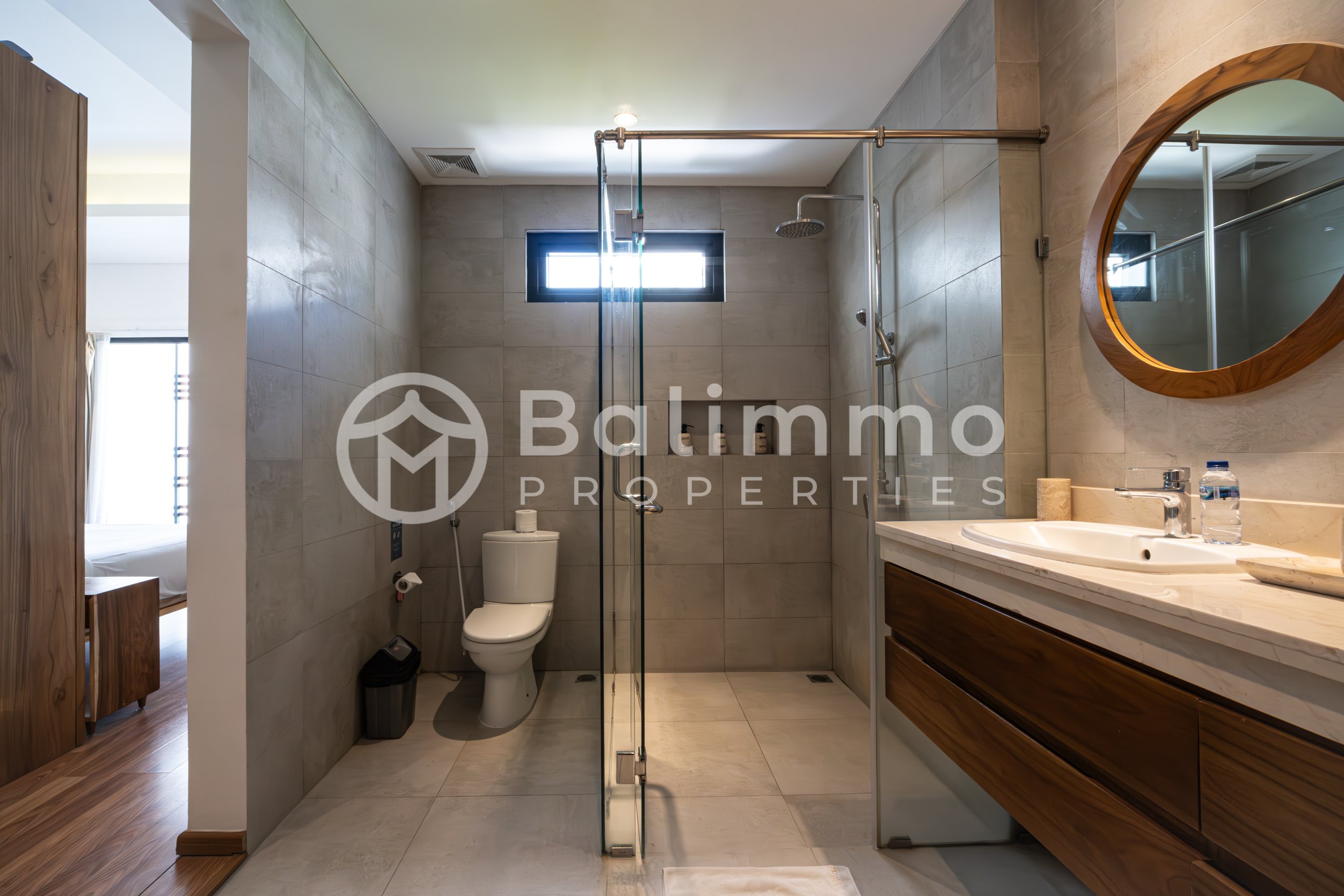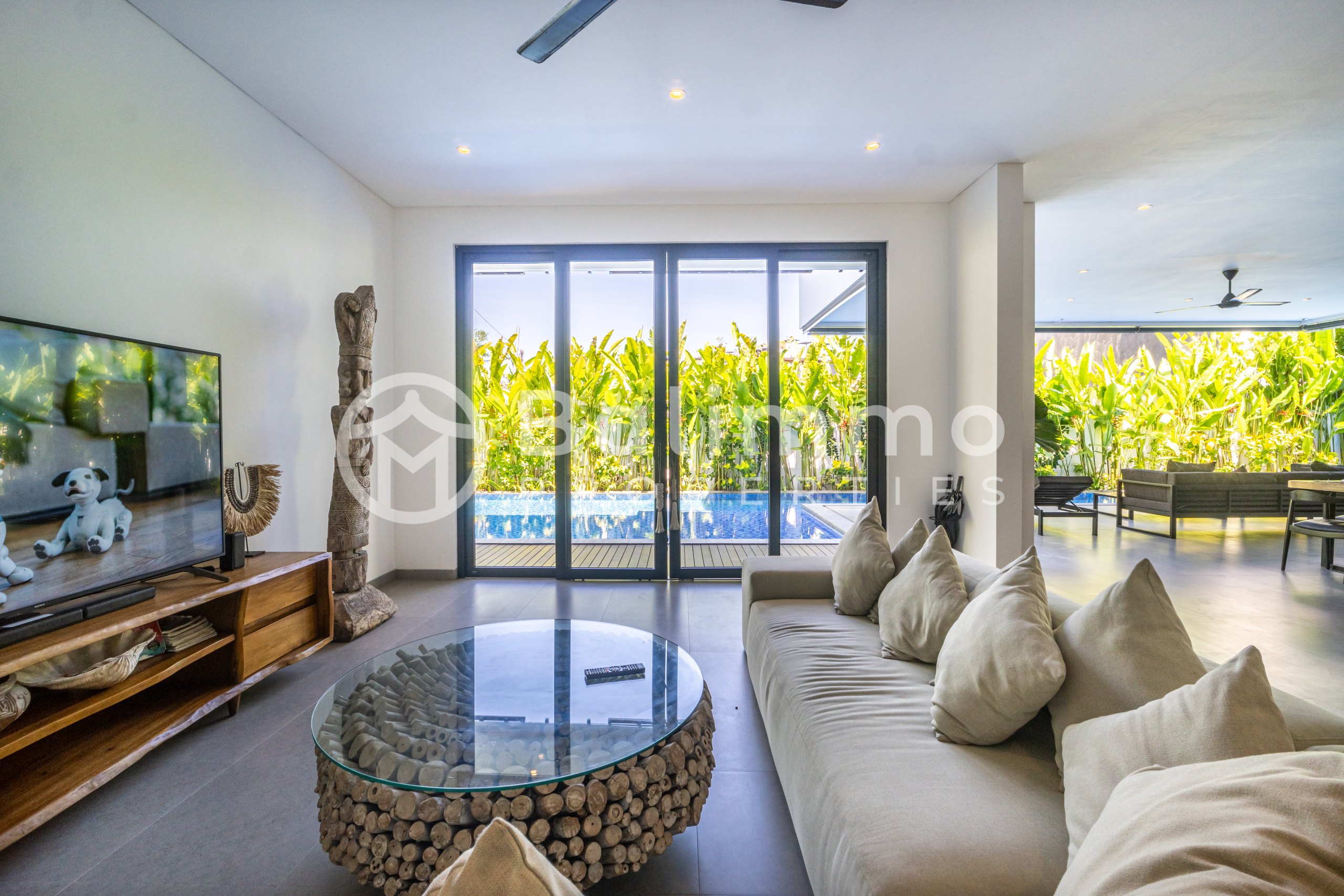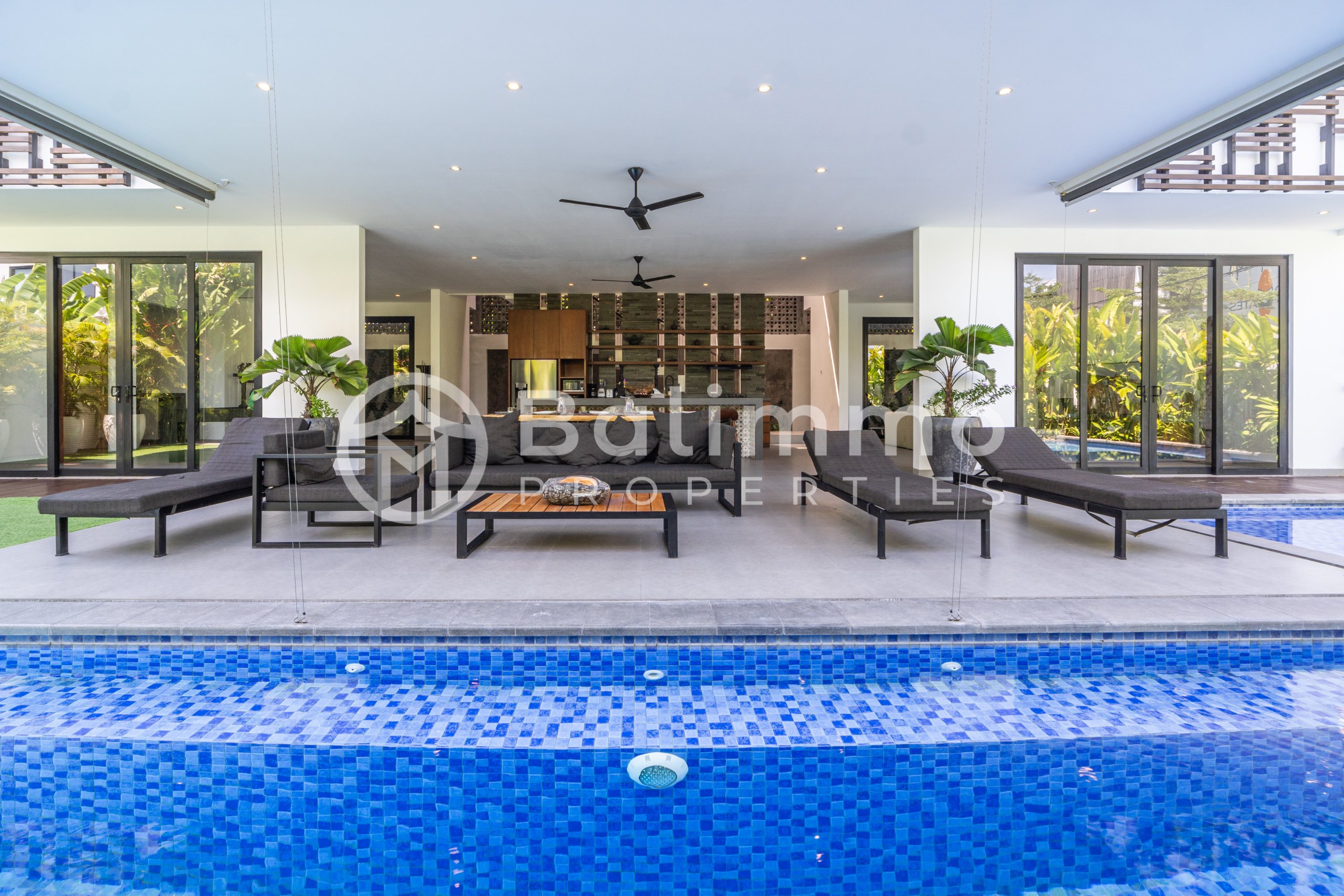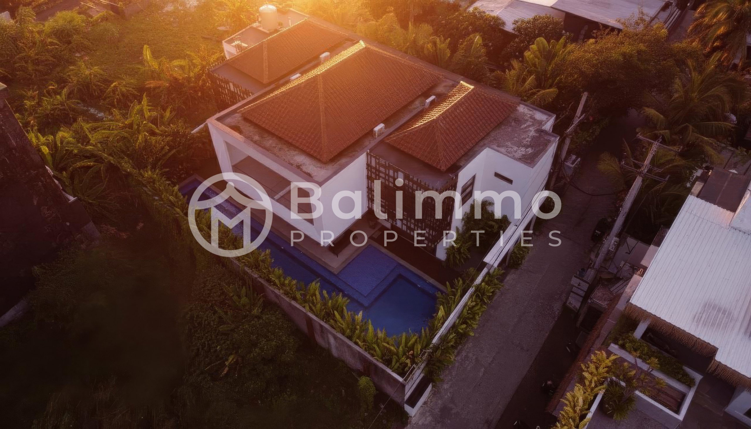 LUXURY 4-Bedroom Villa in Central Canggu Just minutes from Batu Bolong Beach, this villa is located in one of Canggu’s most vibrant yet private areas, surrounded by cafés, beach clubs, gyms, and yoga studios. Set on 4 are of land with 430 m² of built space, the design combines modern lines with tropical elements. Custom wooden screens enhance privacy, while a large swimming pool runs the length of the villa, framed by lush greenery and secure walls. The open-plan living and dining area flows seamlessly to the outdoors. The kitchen is fully equipped with high-end appliances. All four bedrooms include en-suite bathrooms, plus an additional guest bathroom. The villa is fully furnished with quality finishes. Located in the Pink Zone, this leasehold villa includes an SHM (Freehold) permit, ideal for residential use or short-term rentals. Leasehold Land size: 400 m² Building size: 430 m² 4 Bedrooms – 5 Bathrooms Fully furnished Large private pool Pink Zone SHM permit BALIMMO PROPERTIES – Contact us to schedule a visit.