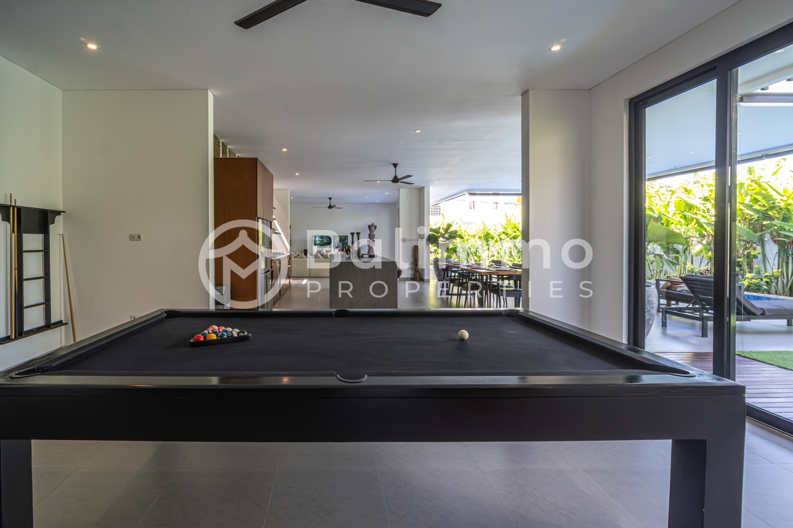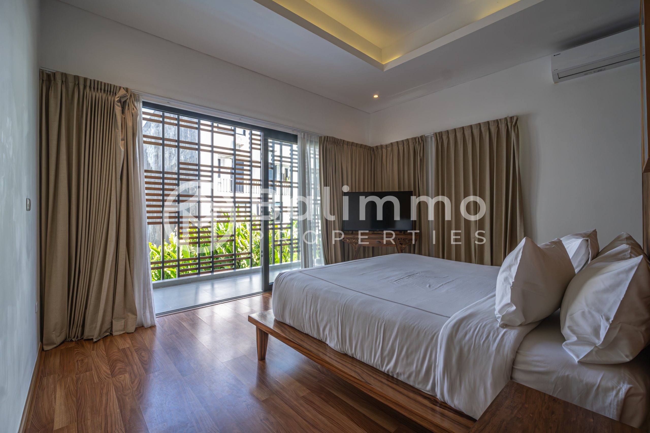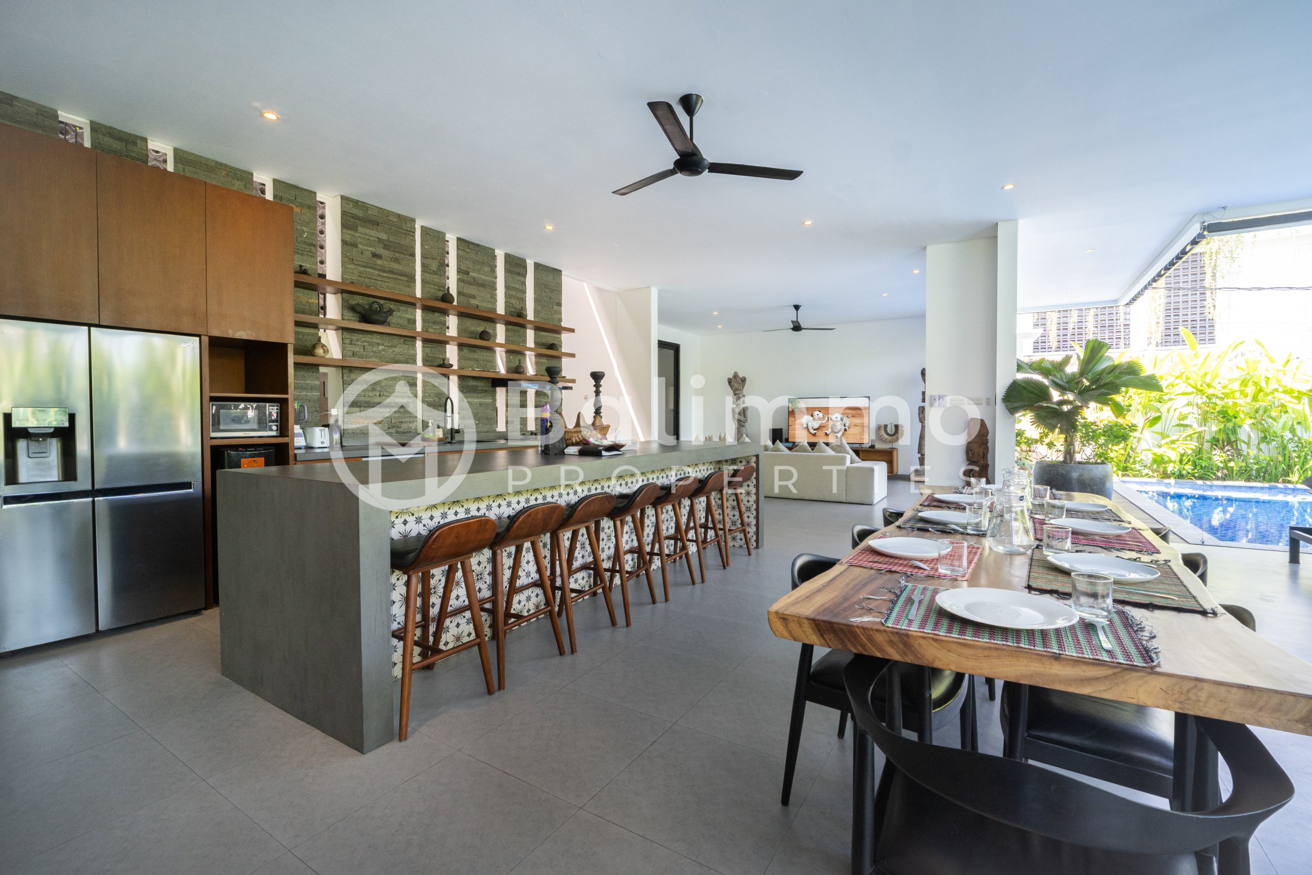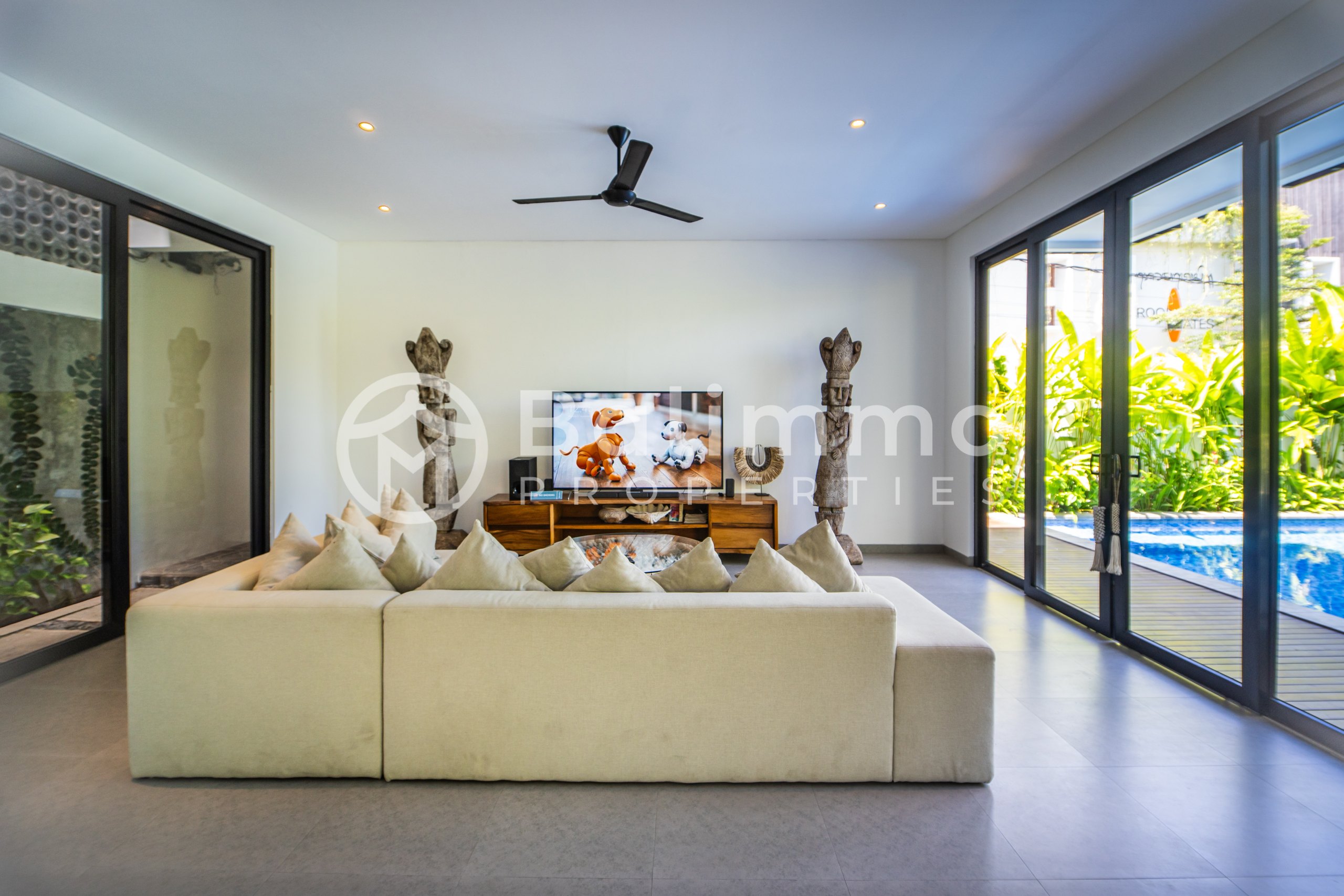 LUXURY 4-Bedroom Villa in Central Canggu Just minutes from Batu Bolong Beach, this villa is located in one of Canggu’s most vibrant yet private areas, surrounded by cafés, beach clubs, gyms, and yoga studios. Set on 4 are of land with 430 m² of built space, the design combines modern lines with tropical elements. Custom wooden screens enhance privacy, while a large swimming pool runs the length of the villa, framed by lush greenery and secure walls. The open-plan living and dining area flows seamlessly to the outdoors. The kitchen is fully equipped with high-end appliances. All four bedrooms include en-suite bathrooms, plus an additional guest bathroom. The villa is fully furnished with quality finishes. Located in the Pink Zone, this leasehold villa includes an SHM (Freehold) permit, ideal for residential use or short-term rentals. Leasehold Land size: 400 m² Building size: 430 m² 4 Bedrooms – 5 Bathrooms Fully furnished Large private pool Pink Zone SHM permit BALIMMO PROPERTIES – Contact us to schedule a visit.
